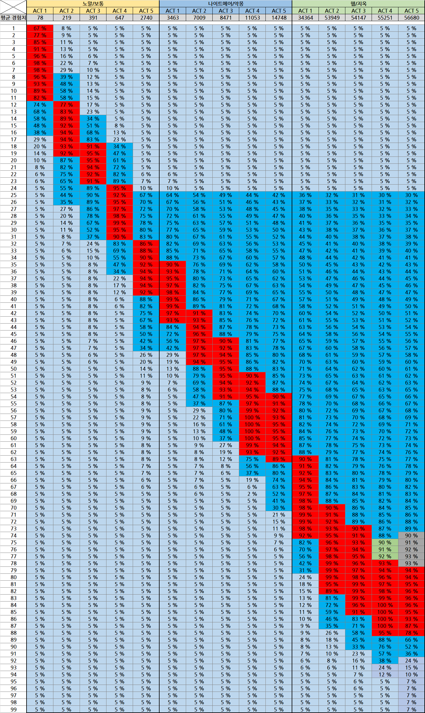 가장 효율적인 플레이는 도표의 빨간칸을 중심으로 액트를 넘어가며 렙업을 하는 것이다.