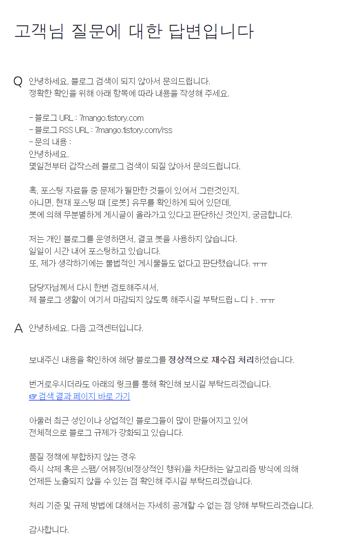 무슨 이유인지 몰라서 이대로 블로그 삭제를 할까? 생각하던 중, 이런 비슷한 사례가 있을 것 같아서 검색을 해보았다.
