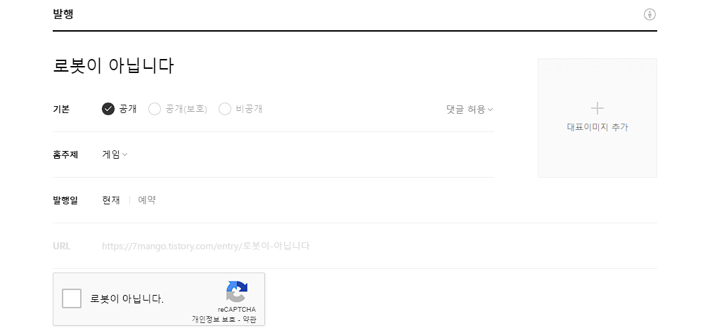 우선, 내 경우에는 방문자수 급감과 비슷한 시기에, 게시글을 발행할 때 '로봇이 아닙니다'를 체크하는 창이 새롭게 생성되었다. 아마도 둘 사이에 상관관계가 있을 것으로 보였다.