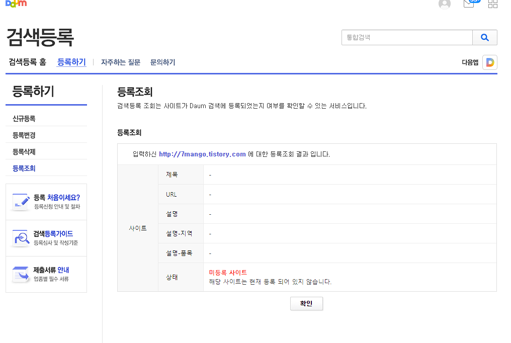 아니나 다를까, 다음 검색 등록에서 조회를 해보았더니 '미등록 사이트'로 나왔다.