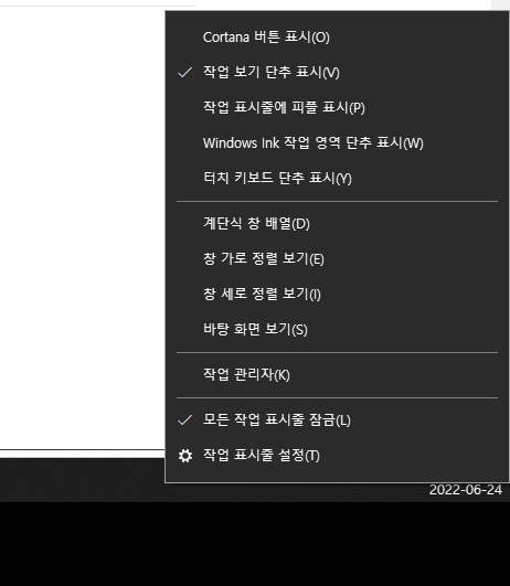 1. 컴퓨터 하단의 작업표시줄 우클릭 (두번째 사진)